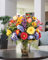Gardeners strive to grow the prettiest, most colorful flowers. Capturing that goal in a grand design, delphiniums, roses, gerbera daisies, black-eyed Susans, hydrangeas, and poppies stand at a striking 27” height in a shapely glass vase of clear acrylic water. An exuberant silk flower focal arrangement for your entry or living room… just watch your guests pause to admire its beauty.