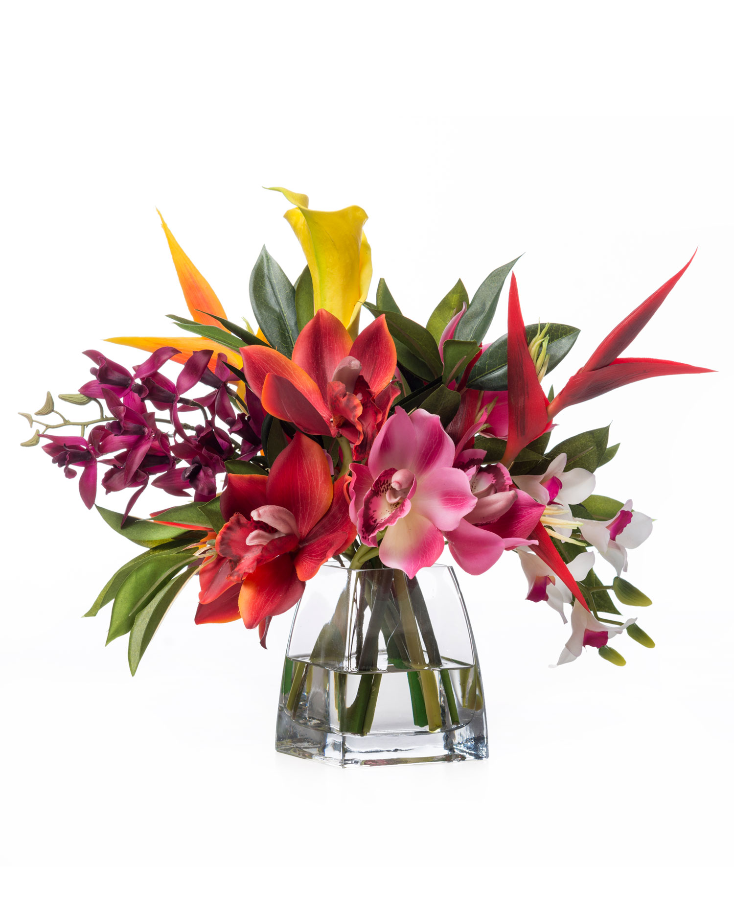 A wonderful mix of remarkably lifelike tropical flowers combine in a heavy glass tapered cube with our clear acrylic water. Bright floral color is enhanced by lush green foliage, capturing the natural beauty and freshness of an island resort in a silk flower arrangement for your home and office decor.