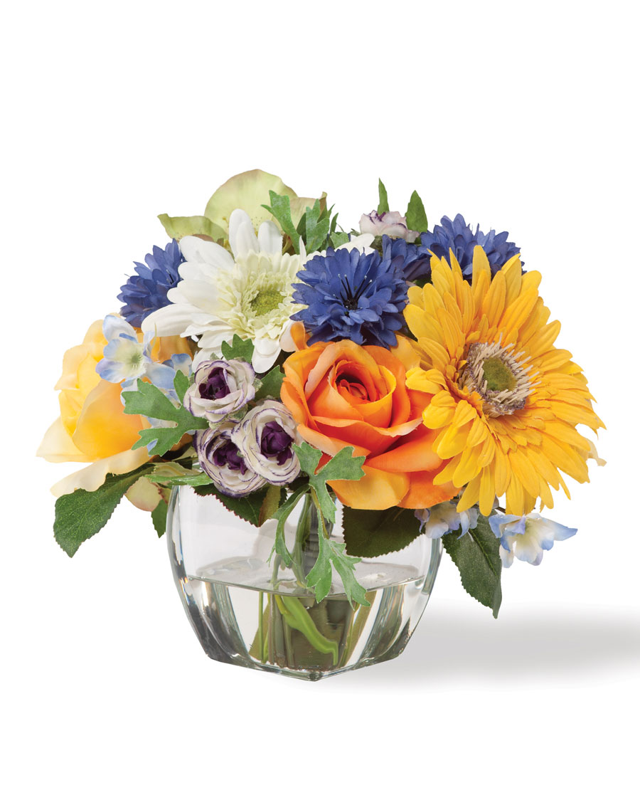 This compact and cute bouquet will add a spritz of fresh floral color to any accent table or desk. Shades of yellow combine with cornflower blue in this acrylic filled 3-1/2" tapered square vase.