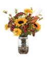 A delightful mix of happy color brightens your day with autumn sunflowers and zinnias arranged in a pint mason jar with stones and clear acrylic water. It's a wonderful artificial floral arrangement for your country chic décor.