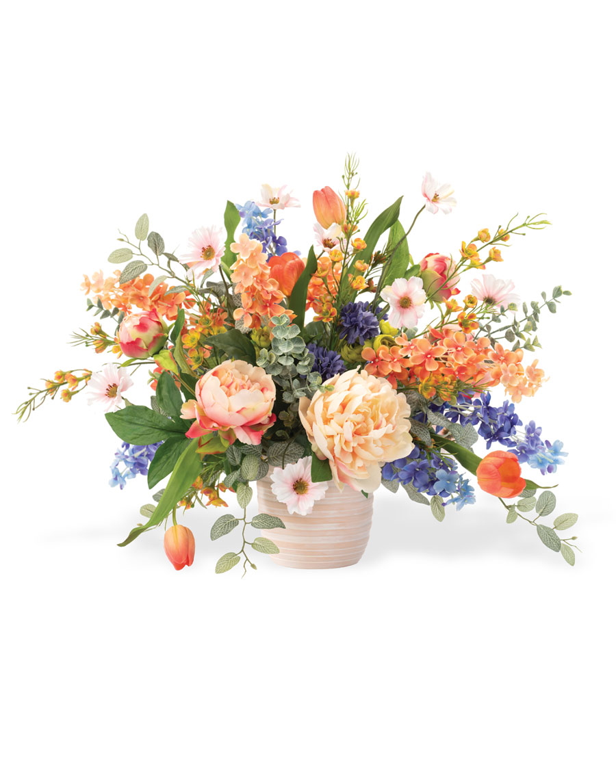 An exuberant floral design of beautiful, harmonious blooms - roses, chrysanthemums, ranunculus, peonies, cosmos, dill, cornflowers, tulips, wax flower, and larkspur - arranged in a complementary 5” whitewashed terra cotta pot appears as though you just bought out the fresh flower market.