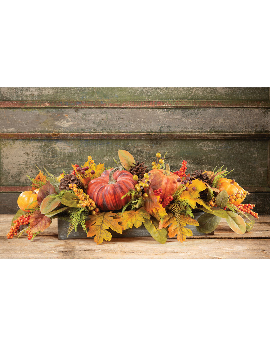 Welcome family and friends with rich hues of autumn foliage and the bountiful flourish of colorful pumpkins, berries, and natural cones. Infuse a wonderful dash of seasonal decor into your home. The wreath and teardrop are lovely on the door, over the mantle, and especially beautiful when complemented with the centerpiece arrangement. Just add the comfort of a cozy fire and enjoy the spiced cider.