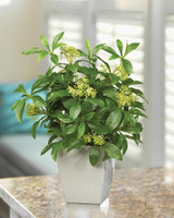 Beautiful, uplifting color, serrated leaf shape, and seed blooms characterize the intriguing appeal of seeded schefflera. Infuse a splash of lively color and natural texture into any room with a carefree faux foliage plant.