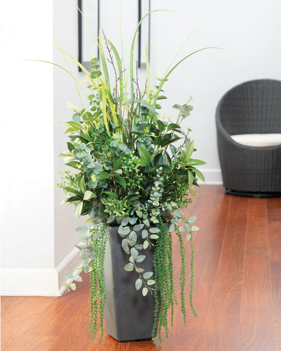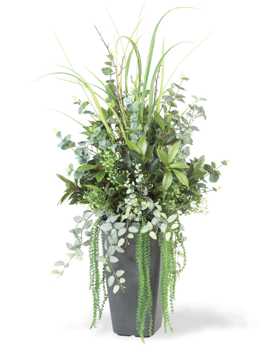 Boasting a plethora of foliage variety and a wonderful blending of natural green color arranged in a 16” tall Granite Gray resin container, its unsurpassed beauty, texture, and fresh-like realism will impress and turn heads as a focal center of your space.