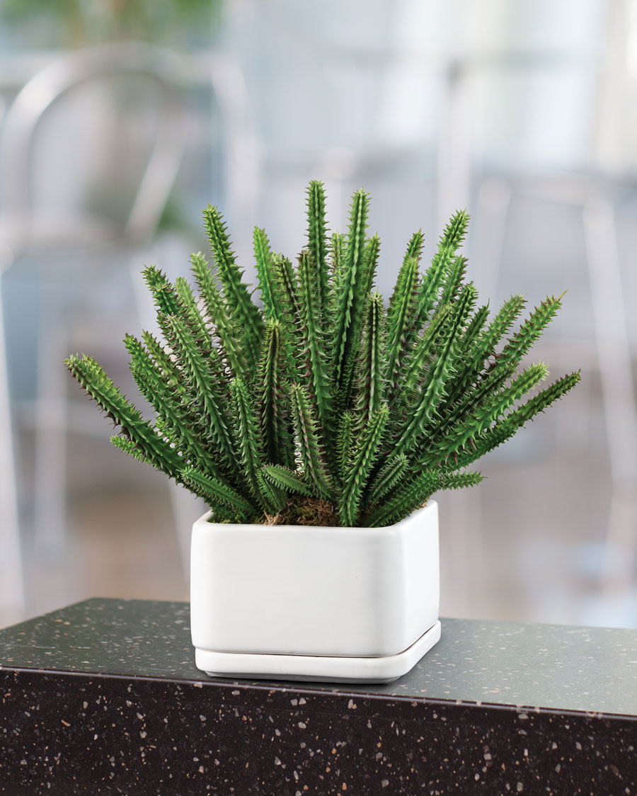 A charming design featuring lifelike spikey cactus nestled in a sleek 4” square ceramic planter. Enjoy the calming, Zen-like presence of a carefree succulent without worry. It’s an amazingly realistic faux planter for brightening up any desk, shelf, or tabletop with organic color and texture.