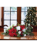 Red velvety poinsettias and hydrangeas, accentuated with creamy white silk magnolias and snowball hydrangeas, nestle among mixed winter foliage. Appropriately designed with a low profile for the table, its festive, holiday color remains fresh and beautiful for this Christmas and many more to come.