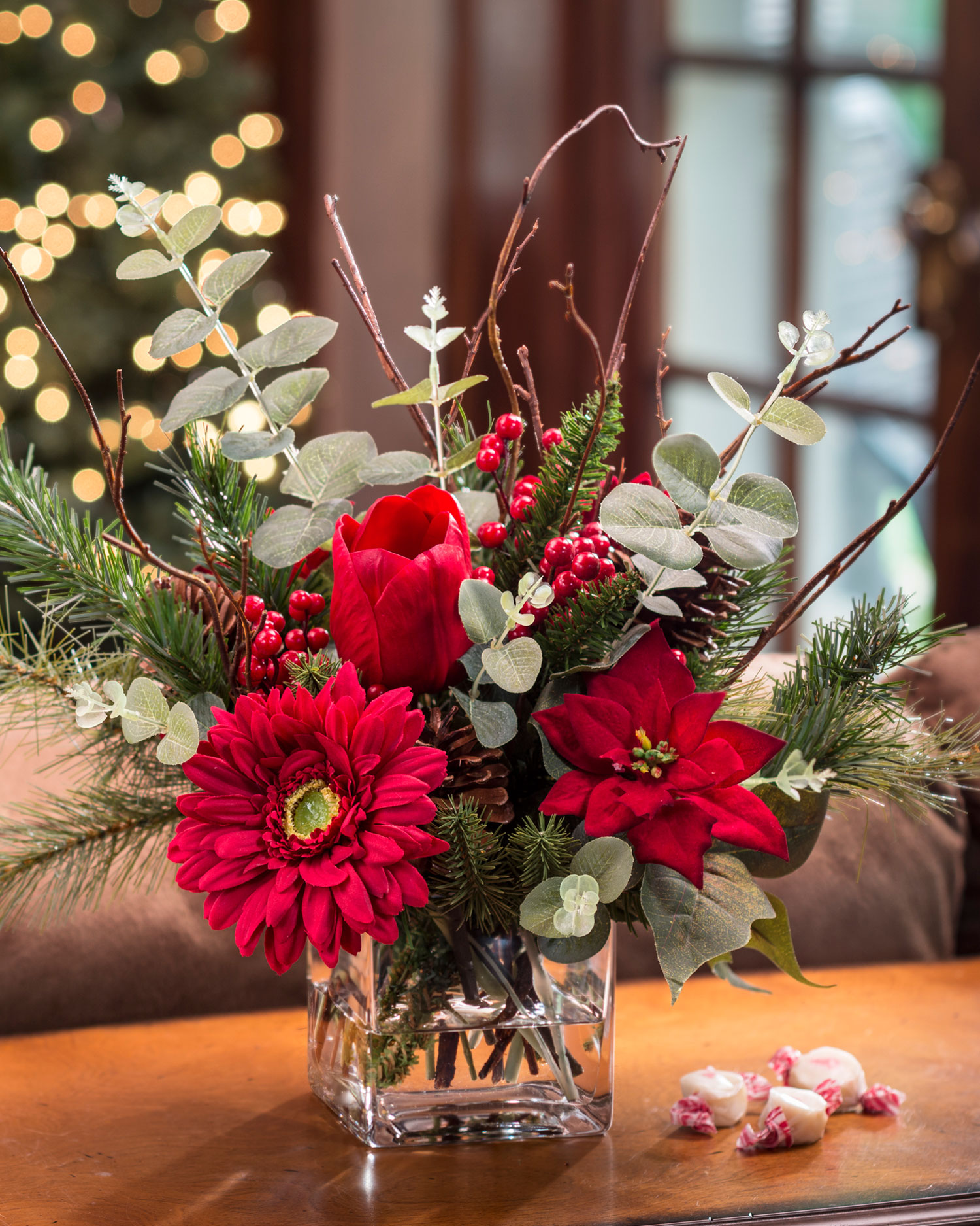 Red gerbera daisy, tulip, and mini poinsettia mingle with winter greenery, cones, and birch twigs in a 4" glass cube vase of our clear acrylic water. It’s a lovely silk flower bouquet of holiday happiness.