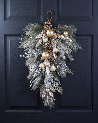 Enrich your interior with the holiday elegance and sophisticated hues of champagne gold and silver. Embellish doors, walls, and mantles with wreaths, teardrops, and garlands of pine, cedar, spruce, and laurel. Enhance tabletops with the centerpiece and sleigh arrangement for an amazing creative finish.