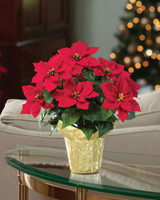 A charming poinsettia bush, with nine velvety red 5-1/2" blooms, complete with gold pot cover, makes a wonderful accent for added holiday cheer in every room. The natural beauty of this vibrant silk poinsettia plant is the perfect way to send Christmas greetings as a gift.