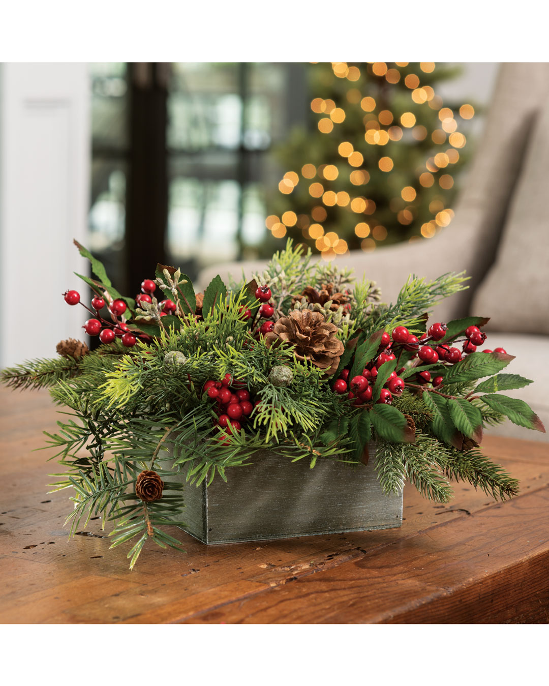 Winter greenery seeded eucalyptus, and cones, mixed with abundant shiny red berries, add traditional holiday color, natural beauty, and texture to your decor. Arranged in a square wooden box, its rugged, outdoor personality is an ideal seasonal addition to your country Christmas.