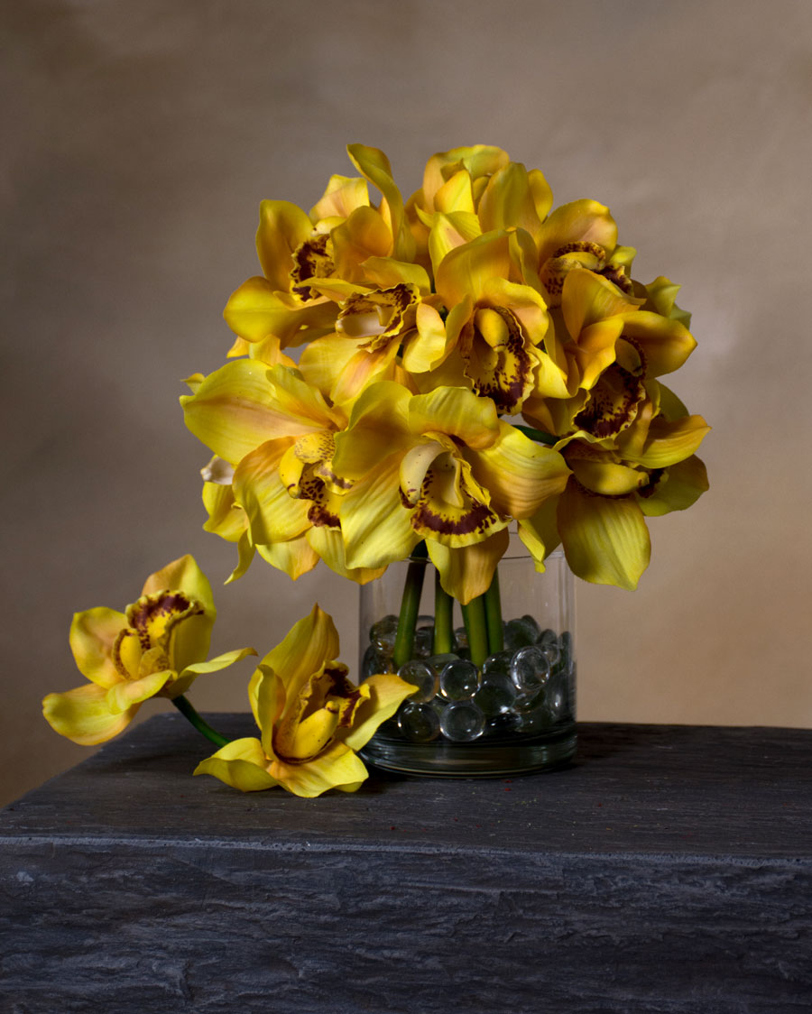 Make a statement with our lifelike 11" Cymbidium Orchid Flower Stem. 10 stems shown in photo with our cylinder vase and glass gems (sold seperately).