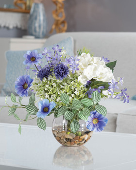 Soft, soothing hues of lifelike blooms artfully arranged in a shapely 5” tall glass vase create a light, airy, and happy ambiance. It makes a much-appreciated gift for loved ones, and a charming addition to any room. The delicate petals of the realistic blooms look fresh and vibrant all year round.