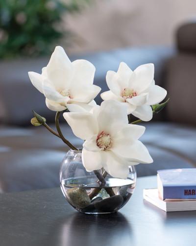 Enjoy the fleeting beauty of these desirable, creamy white blooms all year long. Arranged with black beach stones and clear acrylic water in a 5" ball vase, their incredible realism and natural beauty will fool even the most discerning eye. It makes a beautiful gift that will always be remembered.