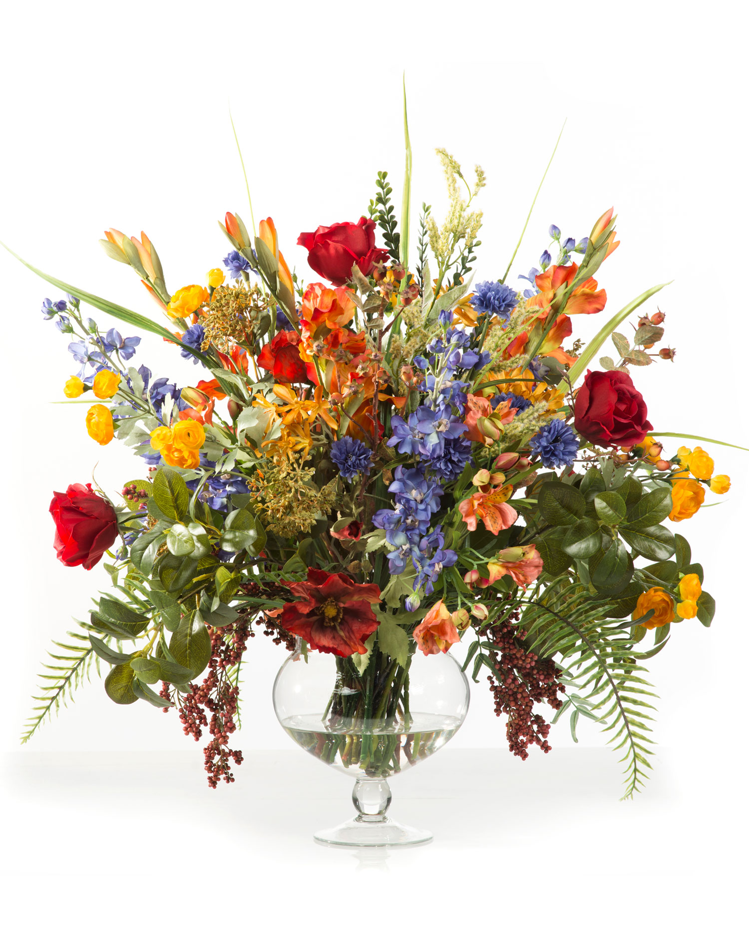 Its bright colors are representative of a summer garden in full bloom. An ample silk bouquet arranged in our voluminous 8" stemmed glass vase with our clear acrylic water. Bold color and distinctive texture combine to make a grand presentation on a large dining or conference table.